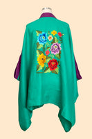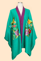 This gorgeous wrap in turquoise with orchid trim is the perfect piece to throw on when you want to make a statement while keeping it casual. Decorated with breathtaking hand embroidered flowers on the front and back. Design is one of a kind, inspired by the colorful flora and fauna of México’s famed Yucatán tropical rainforest. It's your new favorite wrap in a traditional-meets-modern silhouette.