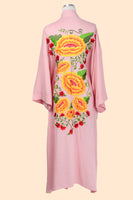 Light and breezy for day or night wear, this pretty and bold kimono style robe is the perfect piece to throw on when you want to make a statement while keeping it casual. Features breathtaking hand embroidered flowers on the front and back. Design is one of a kind, inspired by the colorful flora and fauna of México’s famed Yucatán tropical rainforest. Your new favorite robe in a traditional-meets-modern silhouette — hip and classy.