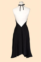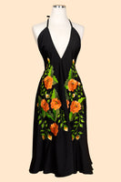 Think of our silk halter dress as the cool cousin to your little black dress — easy, breezy and totally comfortable. The delicate yet bold flowers and drooping neckline make a statement on the front, while the low cutout in the back makes a sultry impression. Wear this little number when you want to feel casual but still look absolutely fab.
